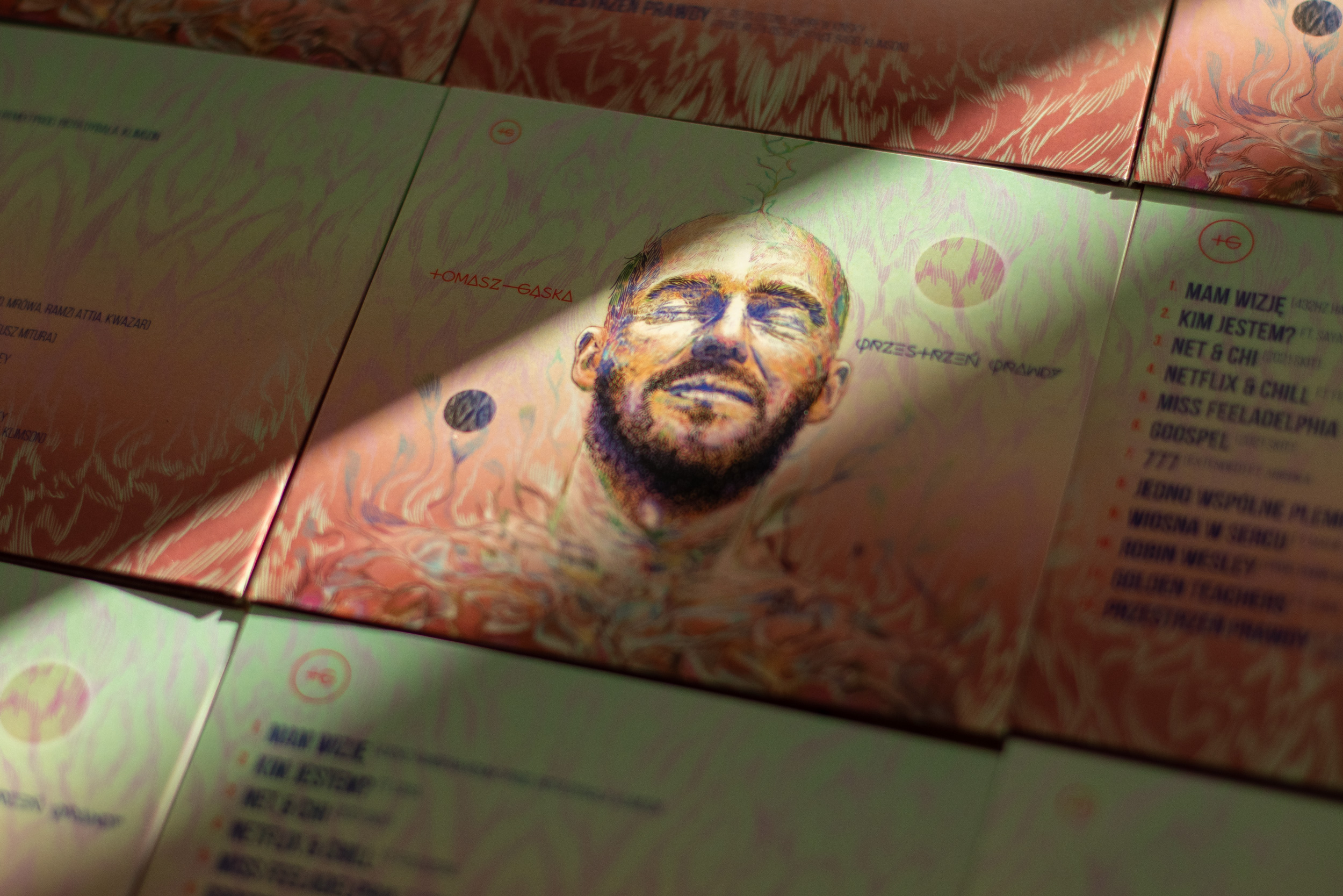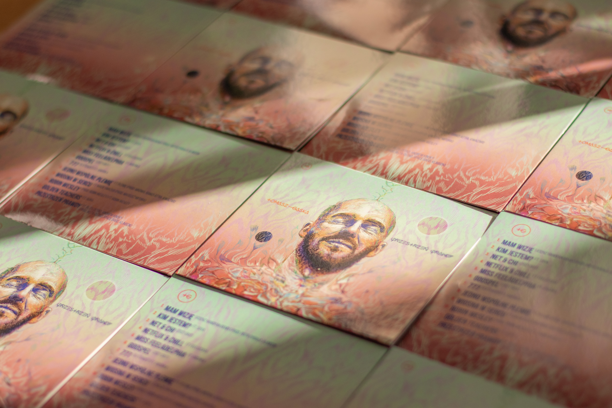 Projektując całe opakowanie płyty zależało nam na spójności graficznej na zewnątrz i wewnątrz wydawnictwa. Motyw który jest tłem do portretu Tomka posłużył nam jako tło na wszystkich pozostałych stronach. Modyfikowaliśmy linie w zależności od strony, tak aby na tyle okładki były inne niż na froncie, tak samo wewnątrz. Nie chcieliśmy powtarzać tego samego wzoru.